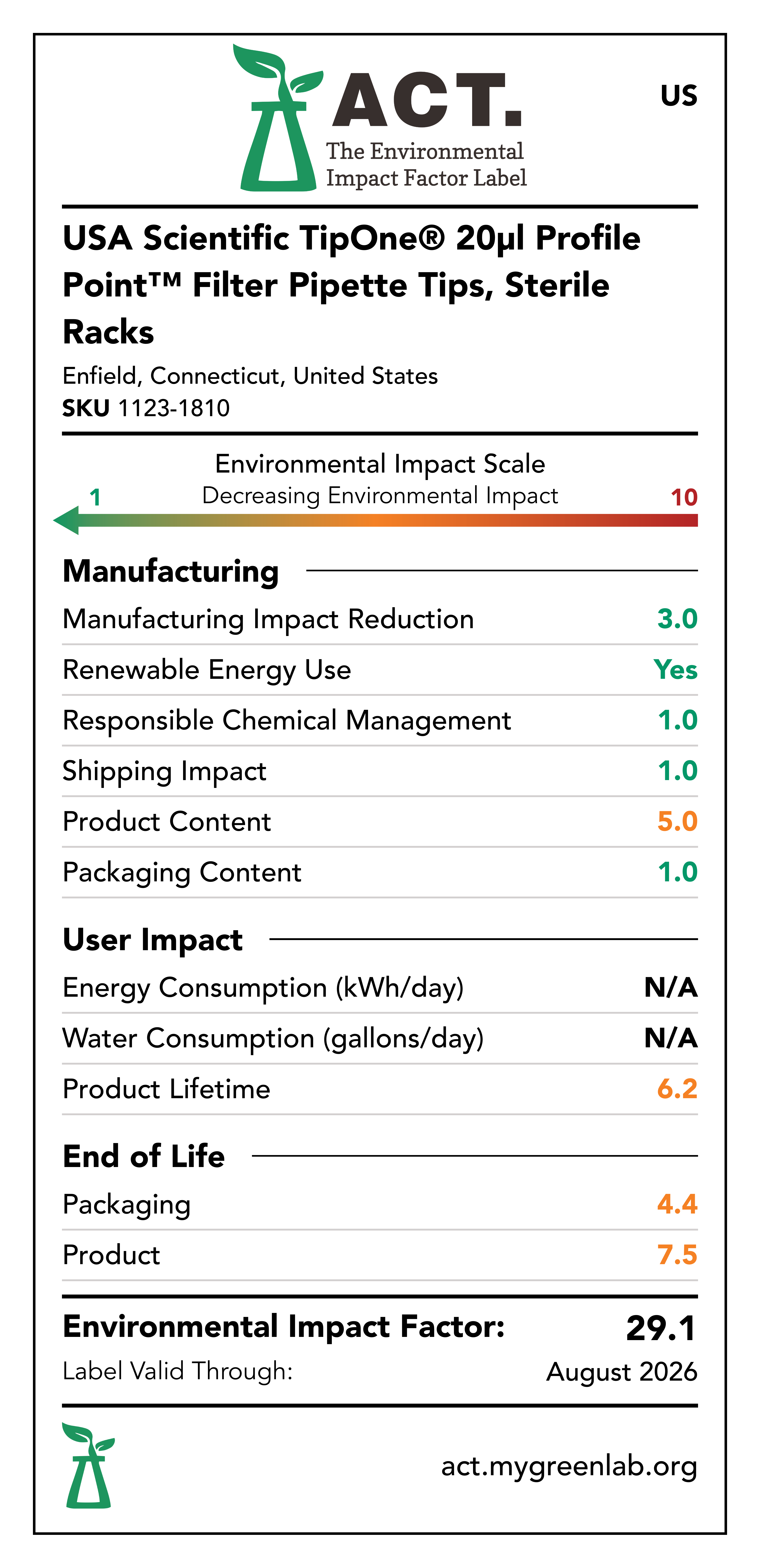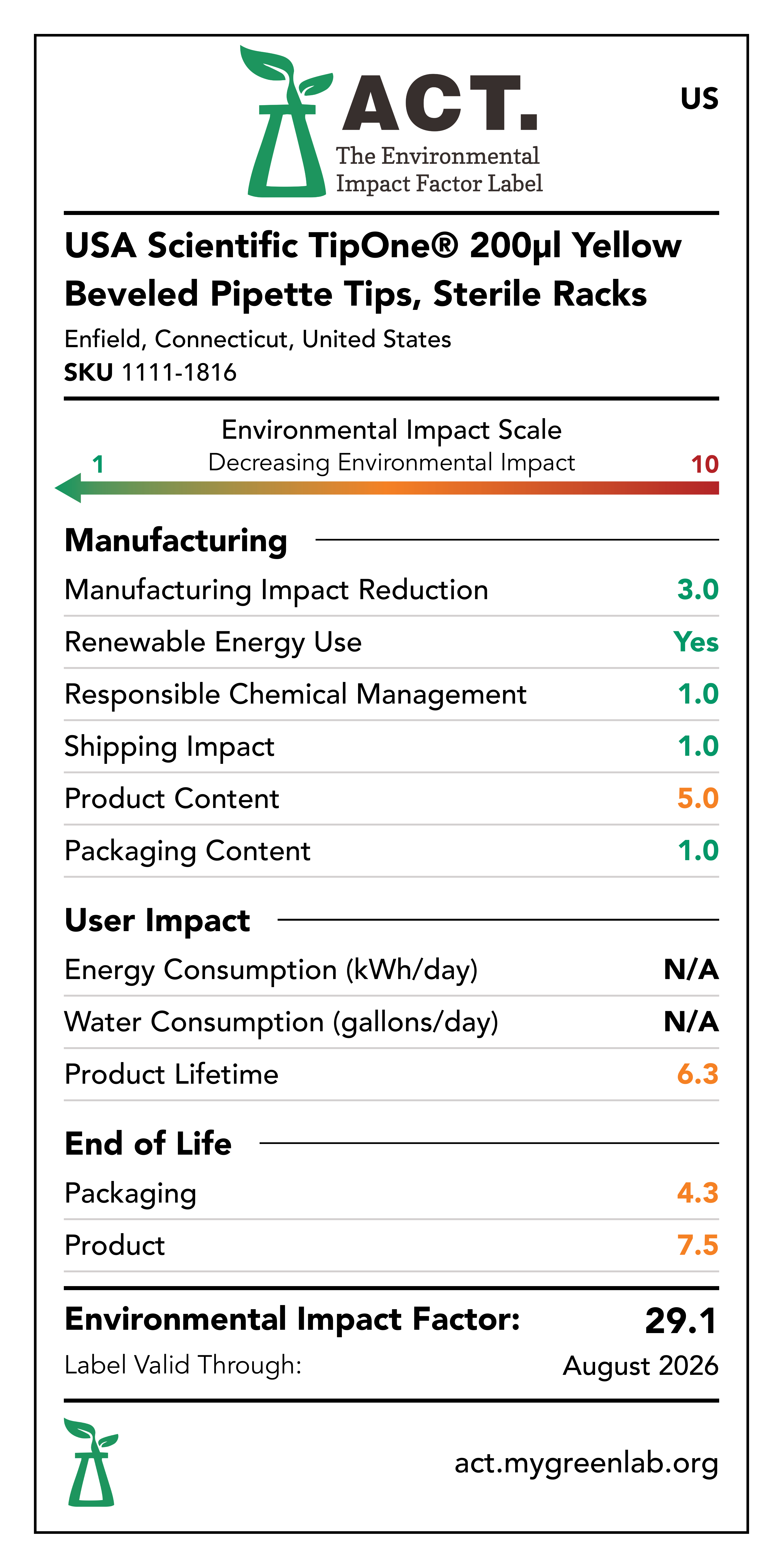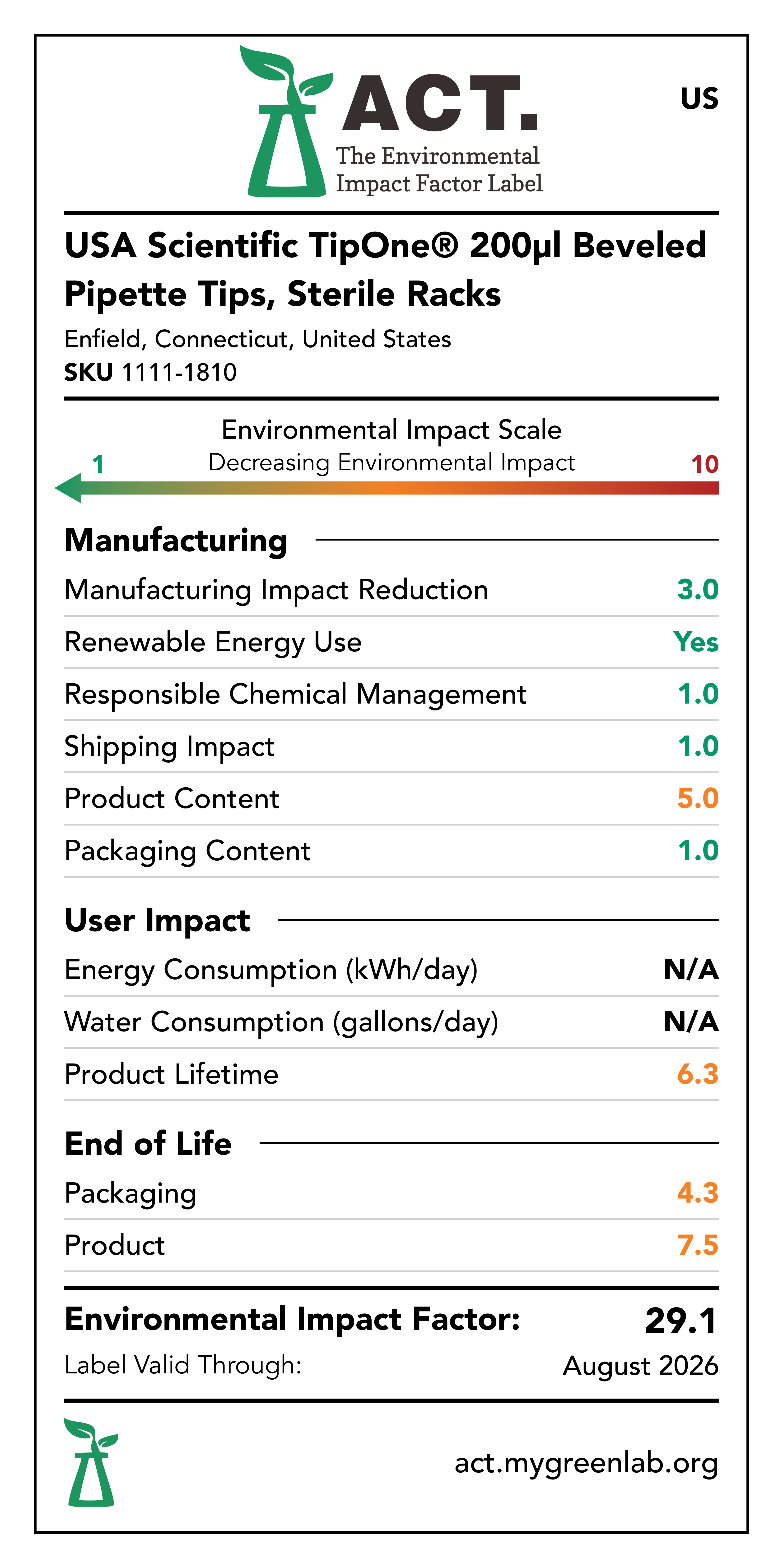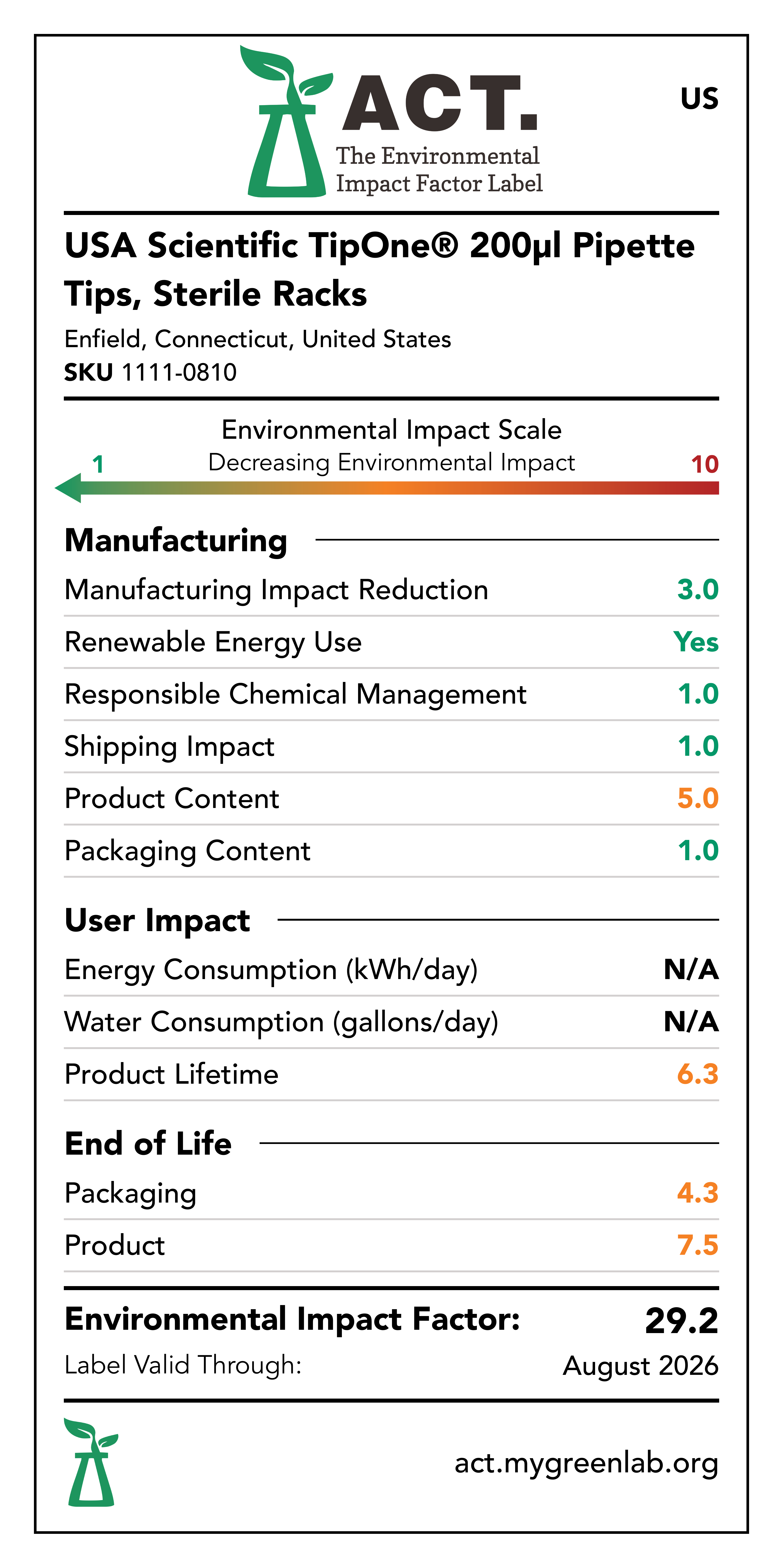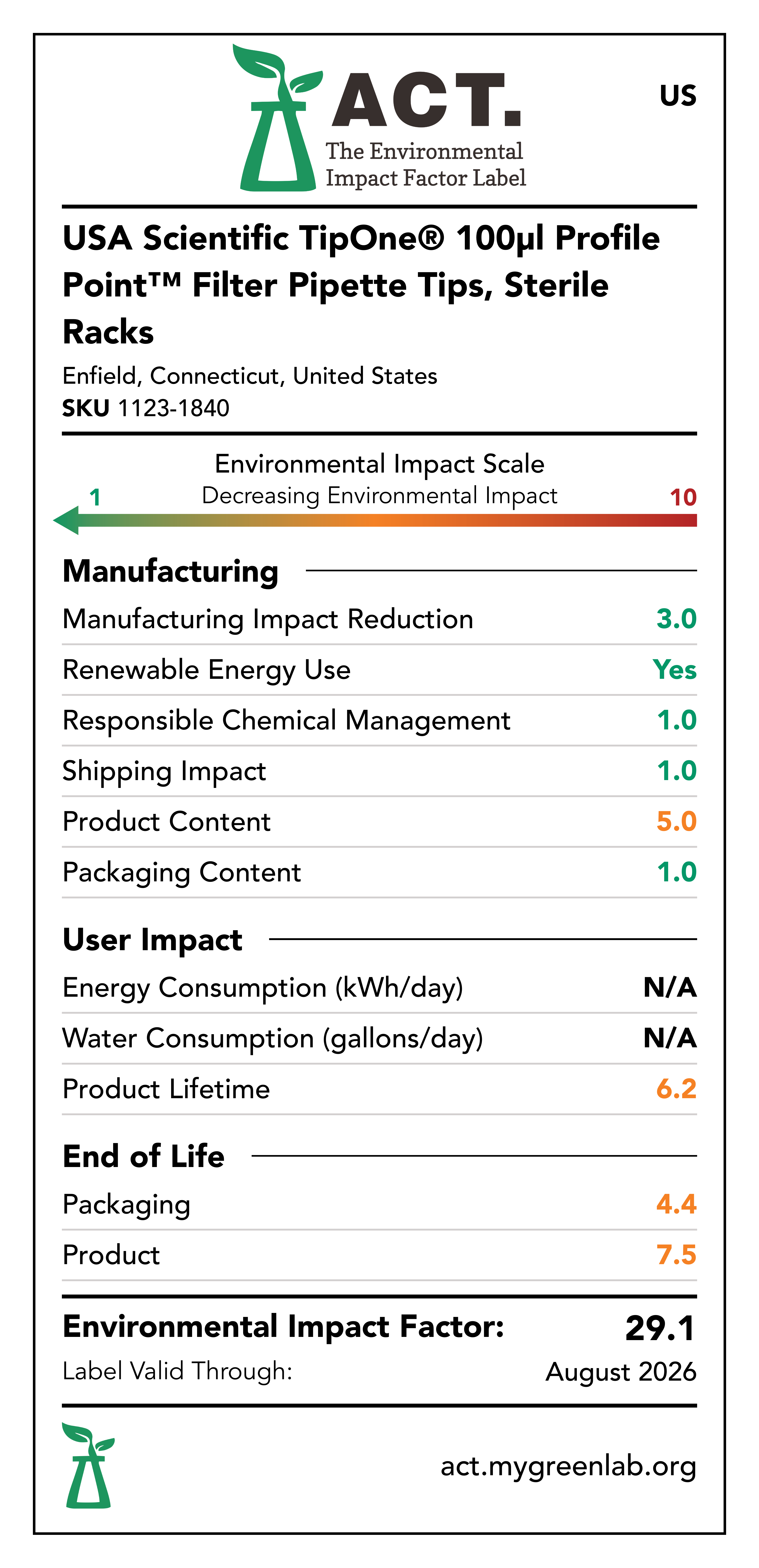 Our commitment to sustainability has been a core value at USA Scientific for decades. We take all facets of improving global health seriously. From our 100% wind-powered TipOne® production facility in Connecticut to our dedication to reducing paper usage, USA Scientific is taking multiple steps to improve our world. We have taken the next step in our sustainability journey by collaborating with My Green Lab, a non-profit organization that is dedicated to improving the sustainability of scientific research. The ACT Environmental Impact Factor Label does just that. Focusing on Accountability, Consistency, and Transparency (ACT), the labels show manufacturing, energy and water use, packaging, and end-of-life impact factors so researchers can make informed decisions about the products they use and their impact on the environment.