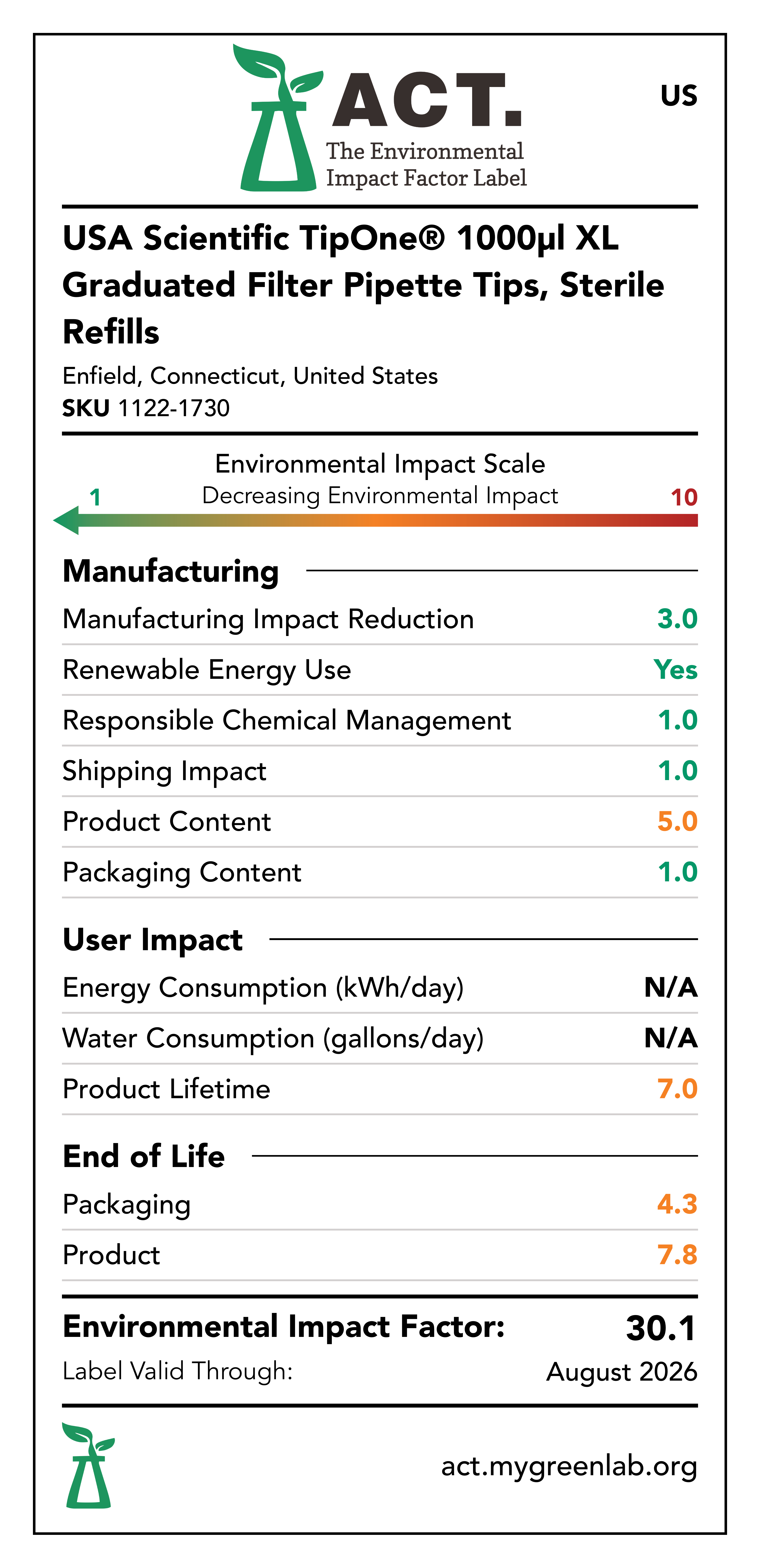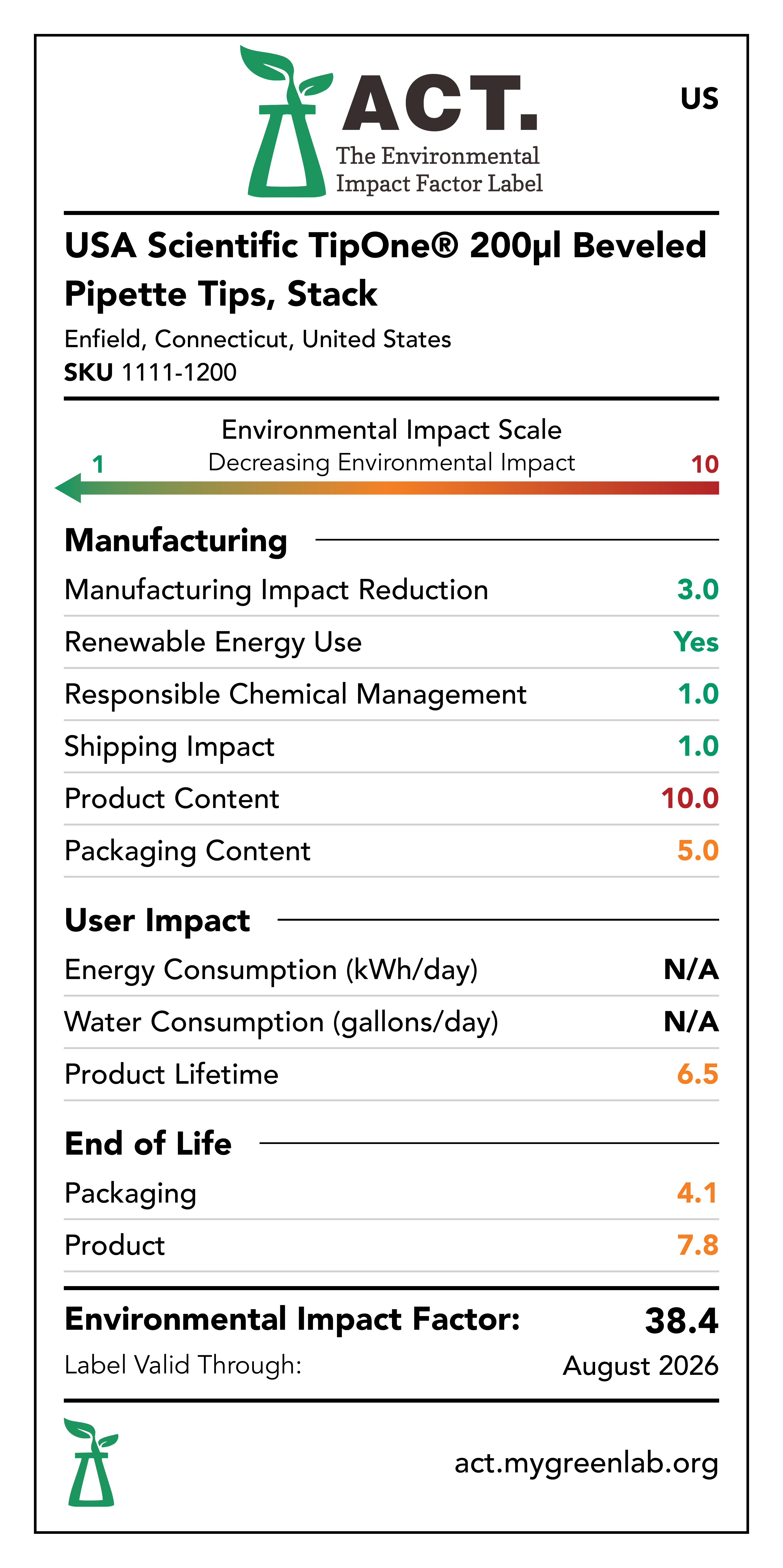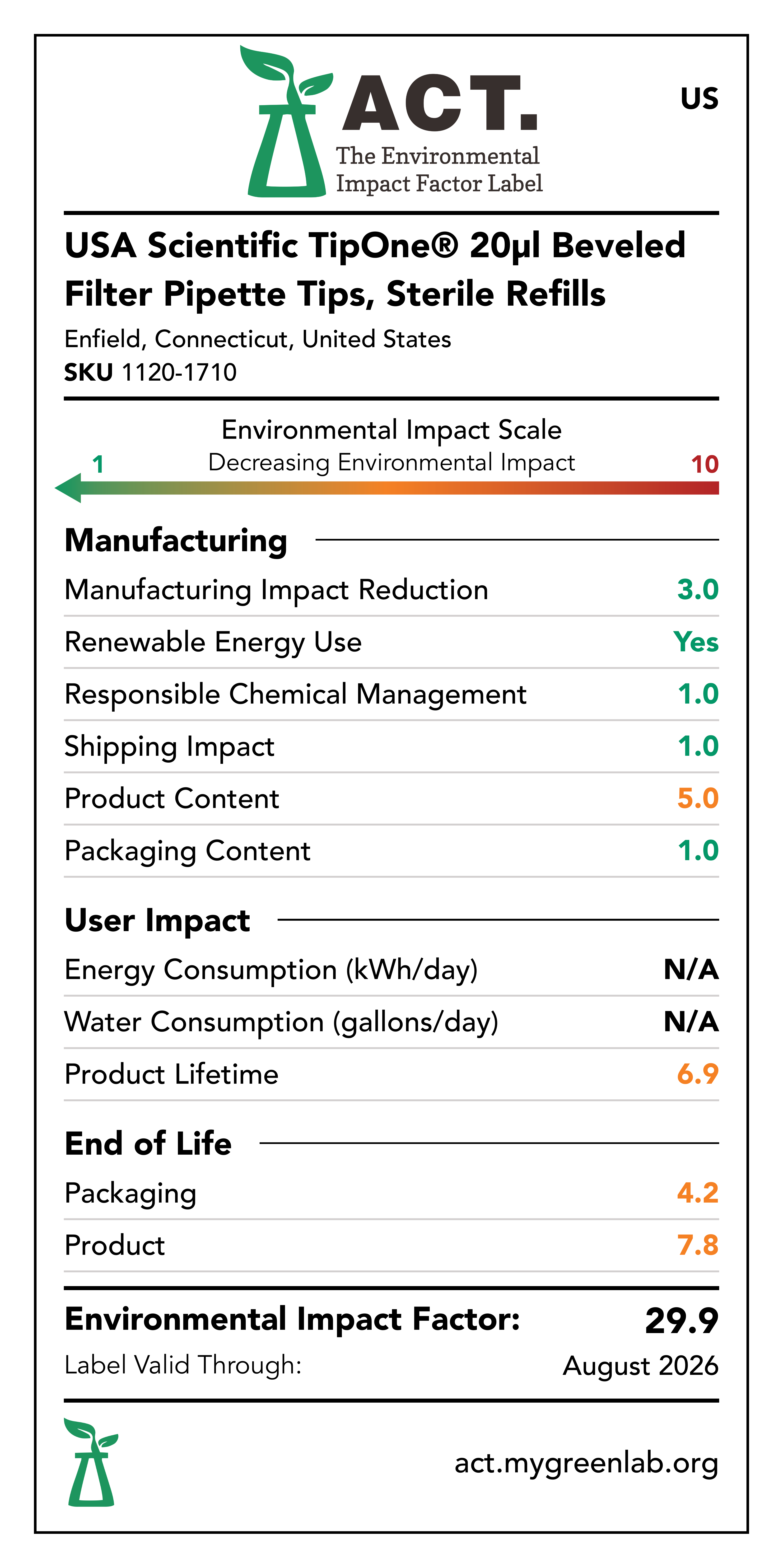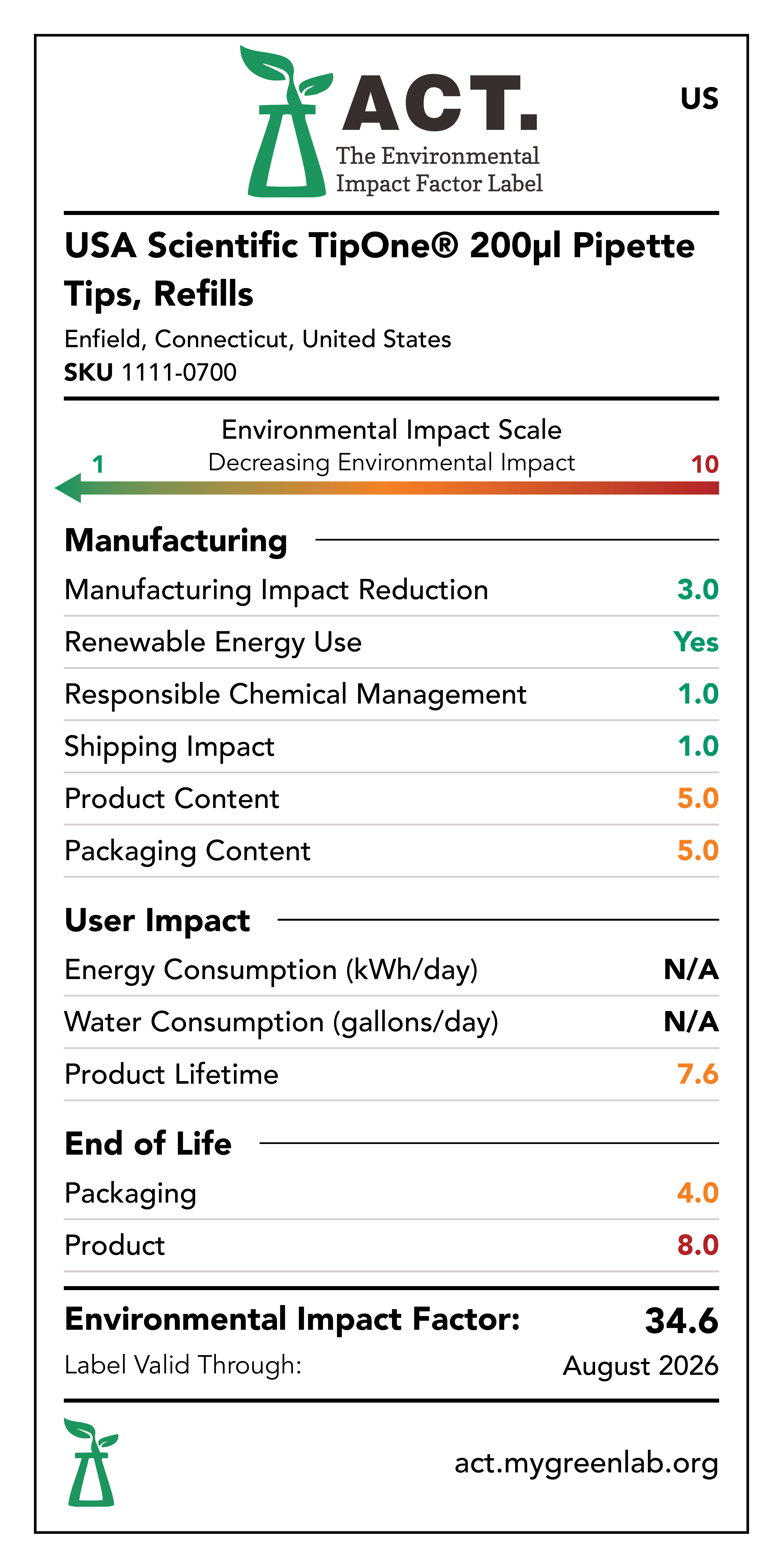 Our commitment to sustainability has been a core value at USA Scientific for decades. We take all facets of improving global health seriously. From our 100% wind-powered TipOne® production facility in Connecticut to our dedication to reducing paper usage, USA Scientific is taking multiple steps to improve our world. We have taken the next step in our sustainability journey by collaborating with My Green Lab, a non-profit organization that is dedicated to improving the sustainability of scientific research. The ACT Environmental Impact Factor Label does just that. Focusing on Accountability, Consistency, and Transparency (ACT), the labels show manufacturing, energy and water use, packaging, and end-of-life impact factors so researchers can make informed decisions about the products they use and their impact on the environment.
