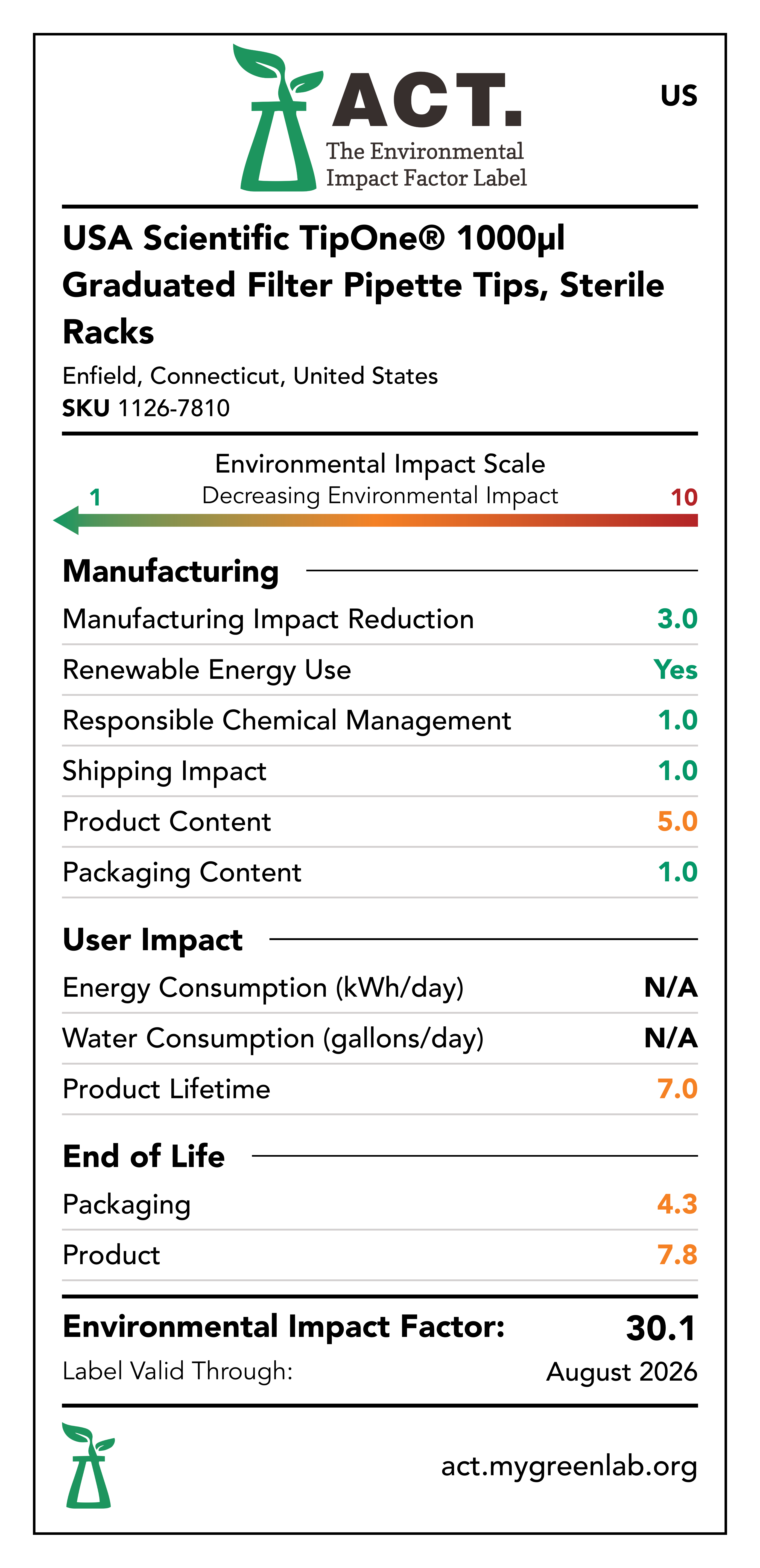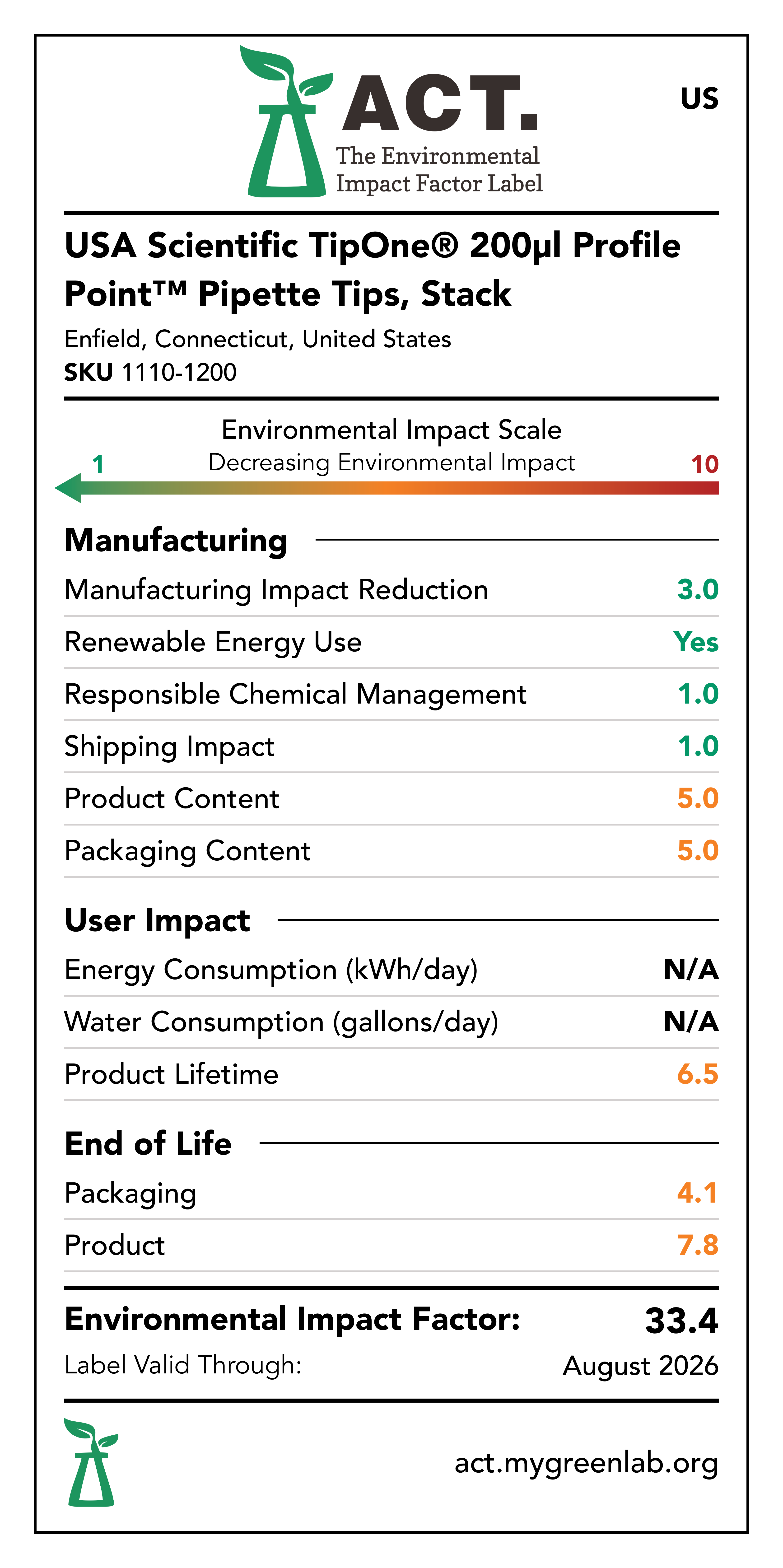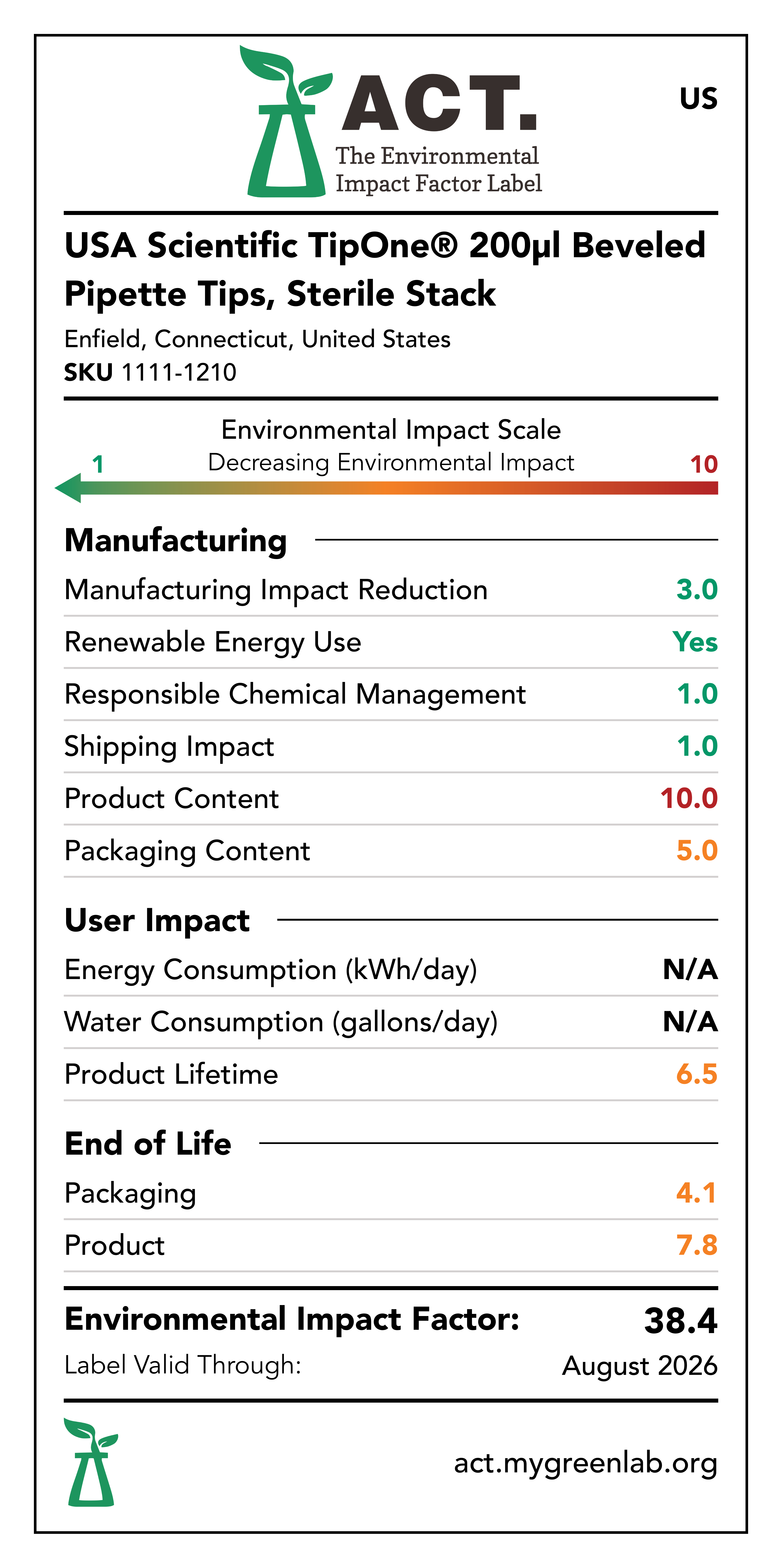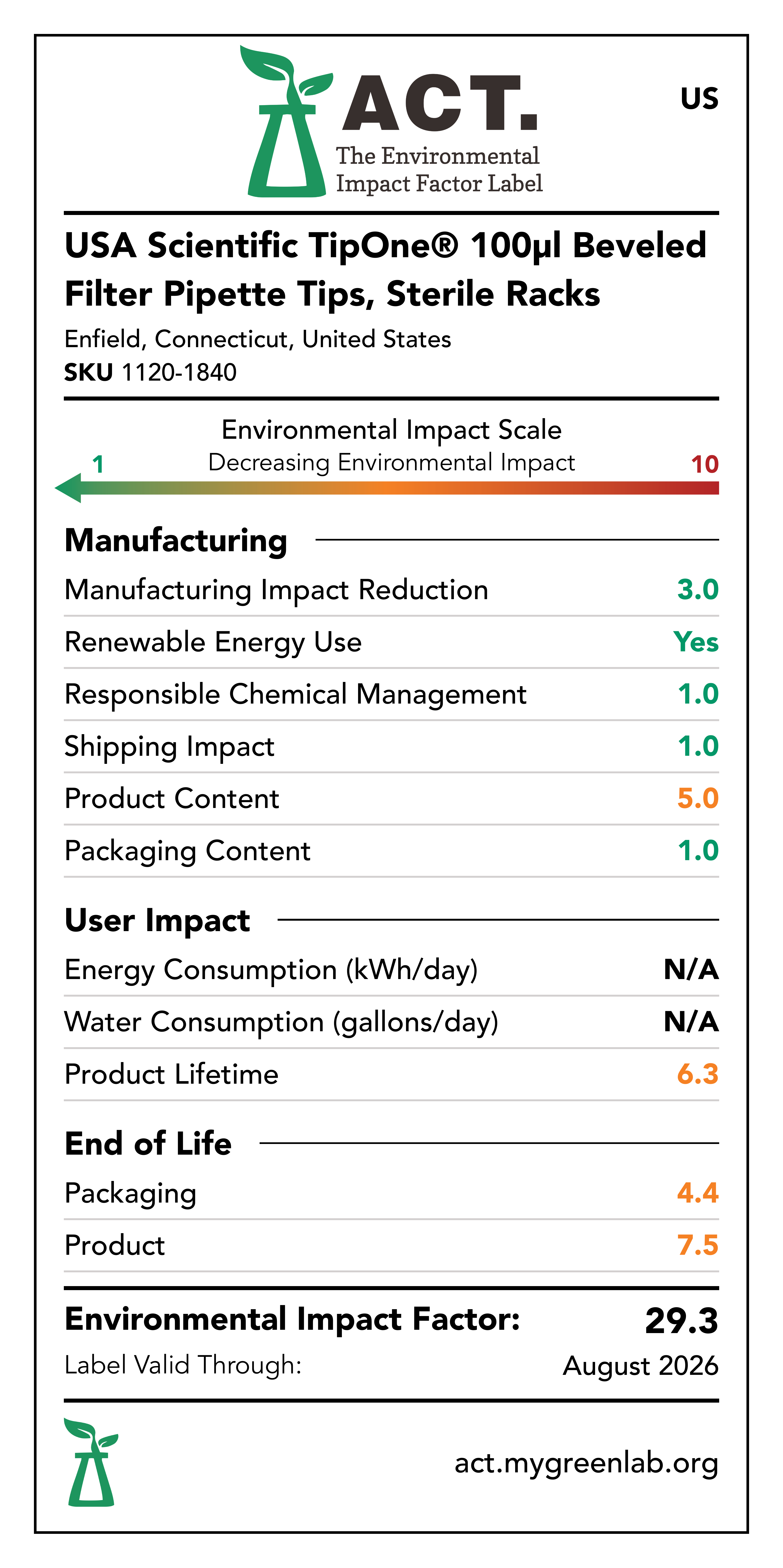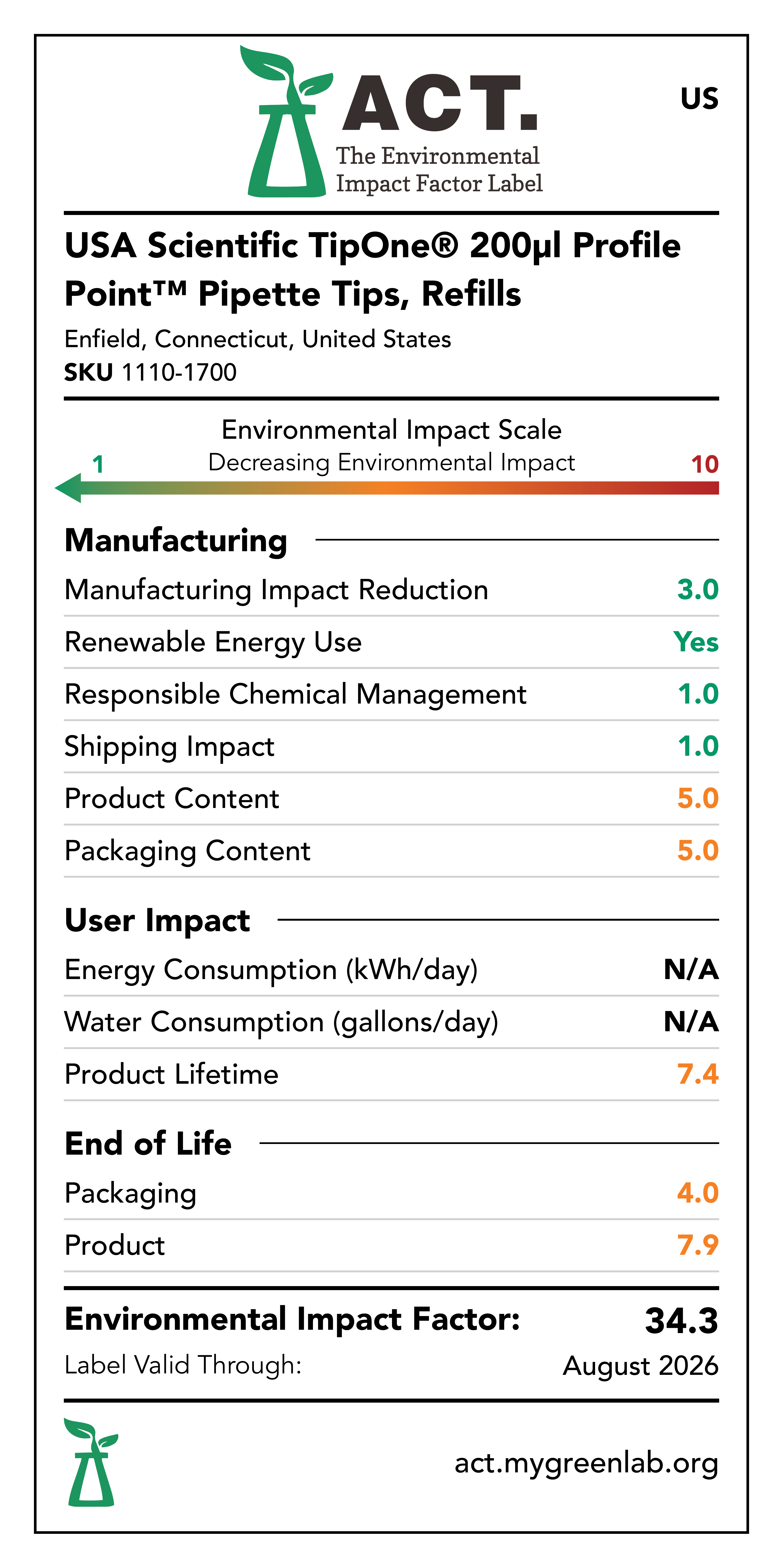 Our commitment to sustainability has been a core value at USA Scientific for decades. We take all facets of improving global health seriously. From our 100% wind-powered TipOne® production facility in Connecticut to our dedication to reducing paper usage, USA Scientific is taking multiple steps to improve our world. We have taken the next step in our sustainability journey by collaborating with My Green Lab, a non-profit organization that is dedicated to improving the sustainability of scientific research. The ACT Environmental Impact Factor Label does just that. Focusing on Accountability, Consistency, and Transparency (ACT), the labels show manufacturing, energy and water use, packaging, and end-of-life impact factors so researchers can make informed decisions about the products they use and their impact on the environment.