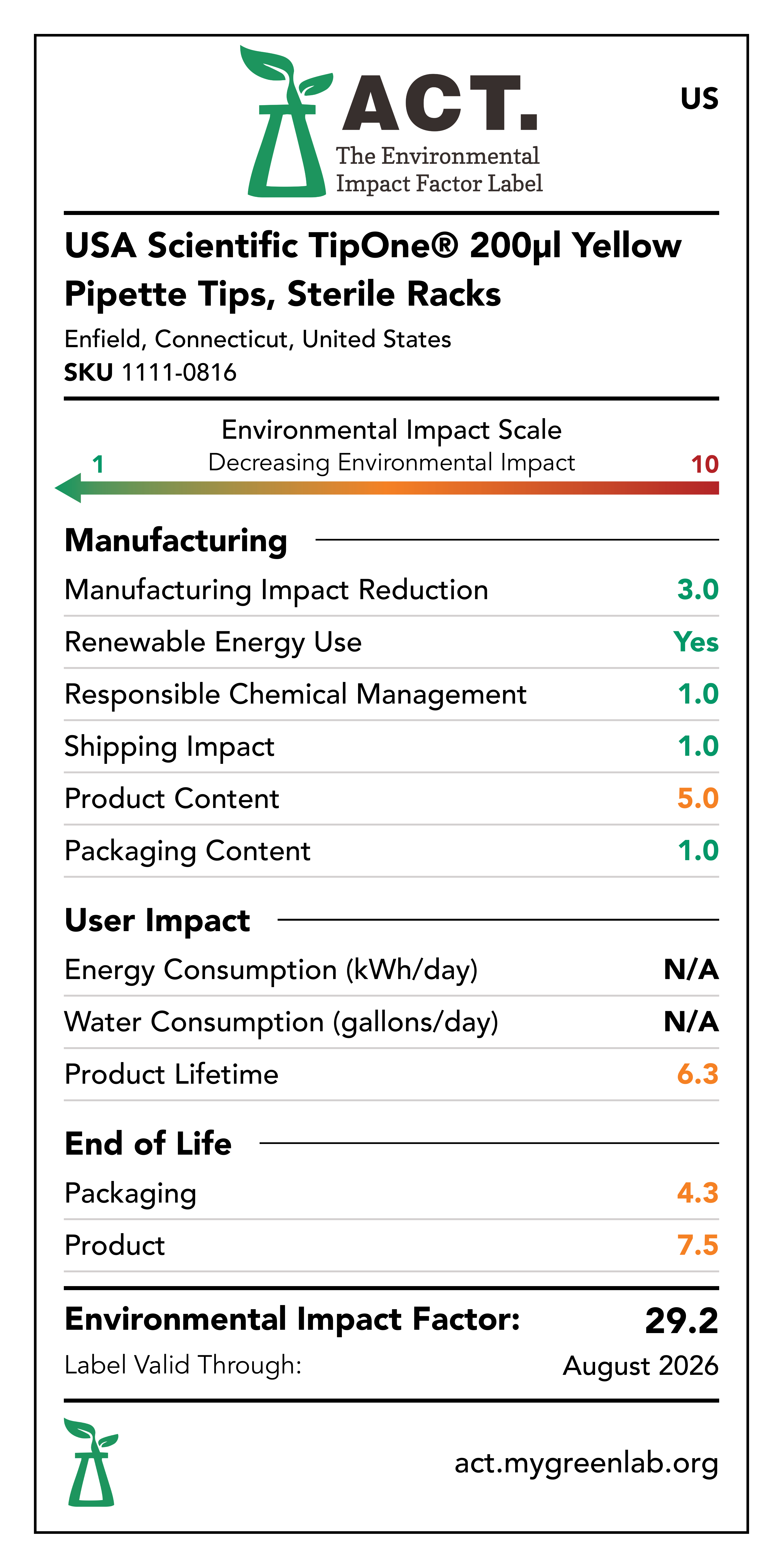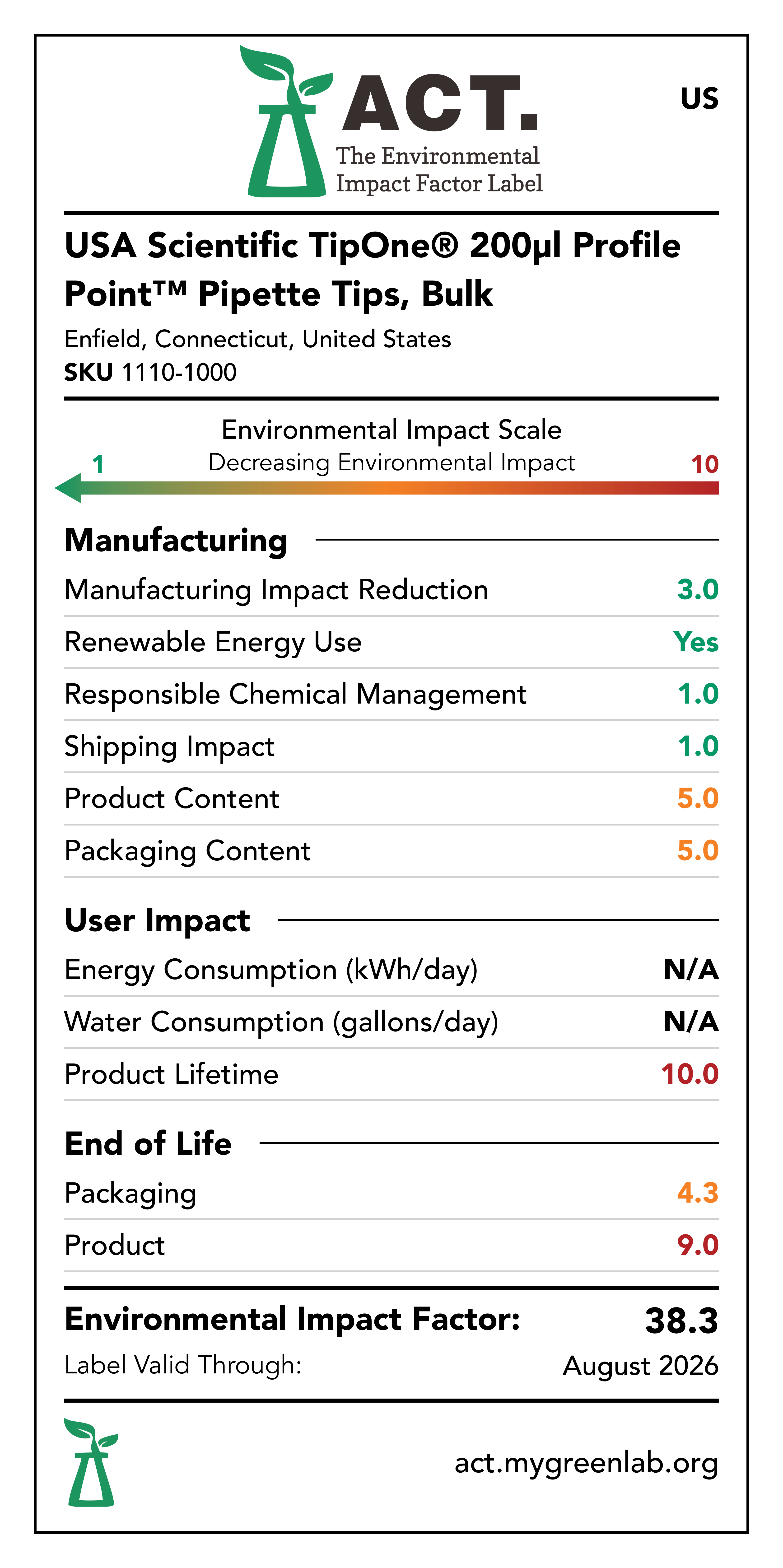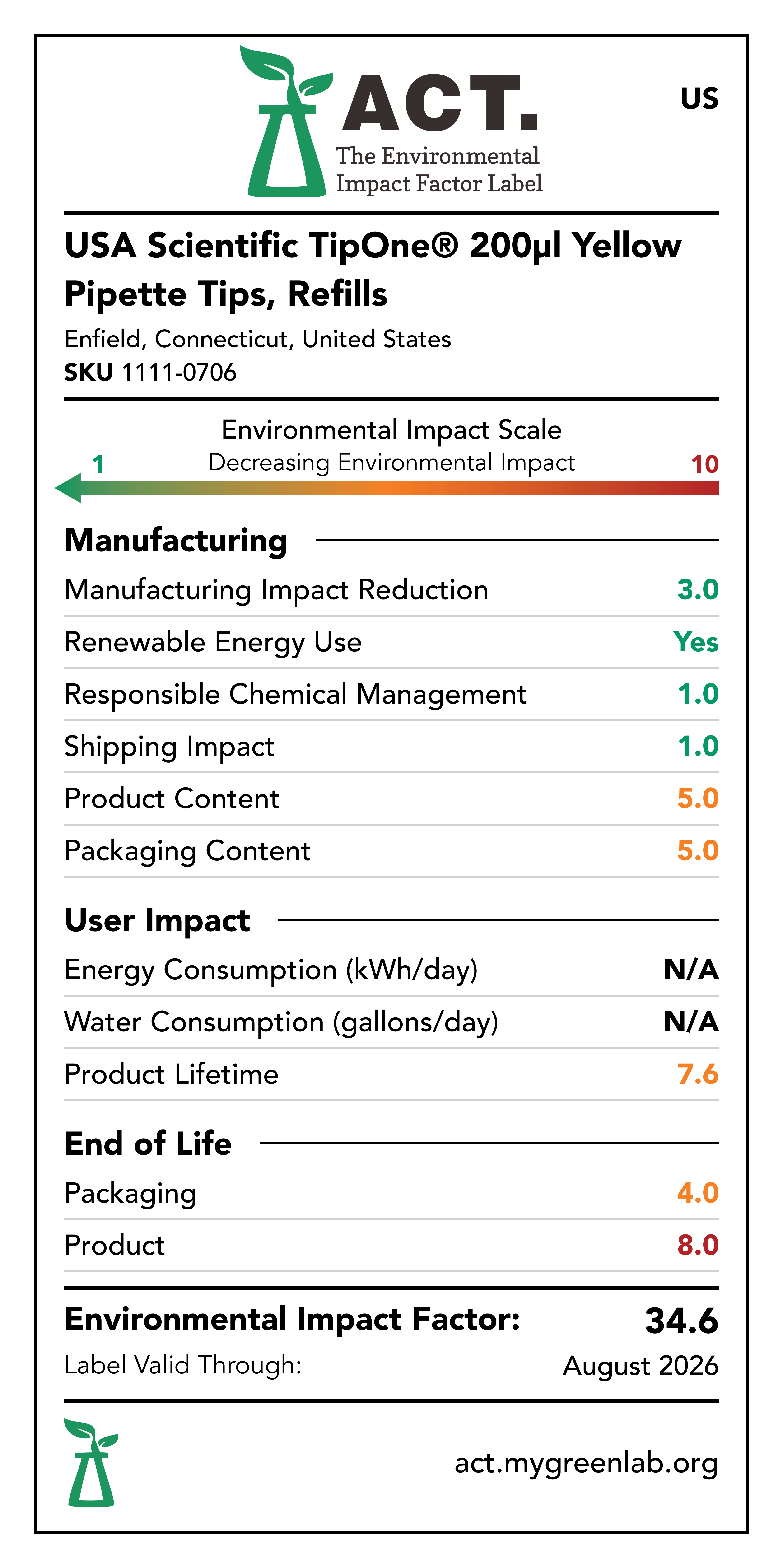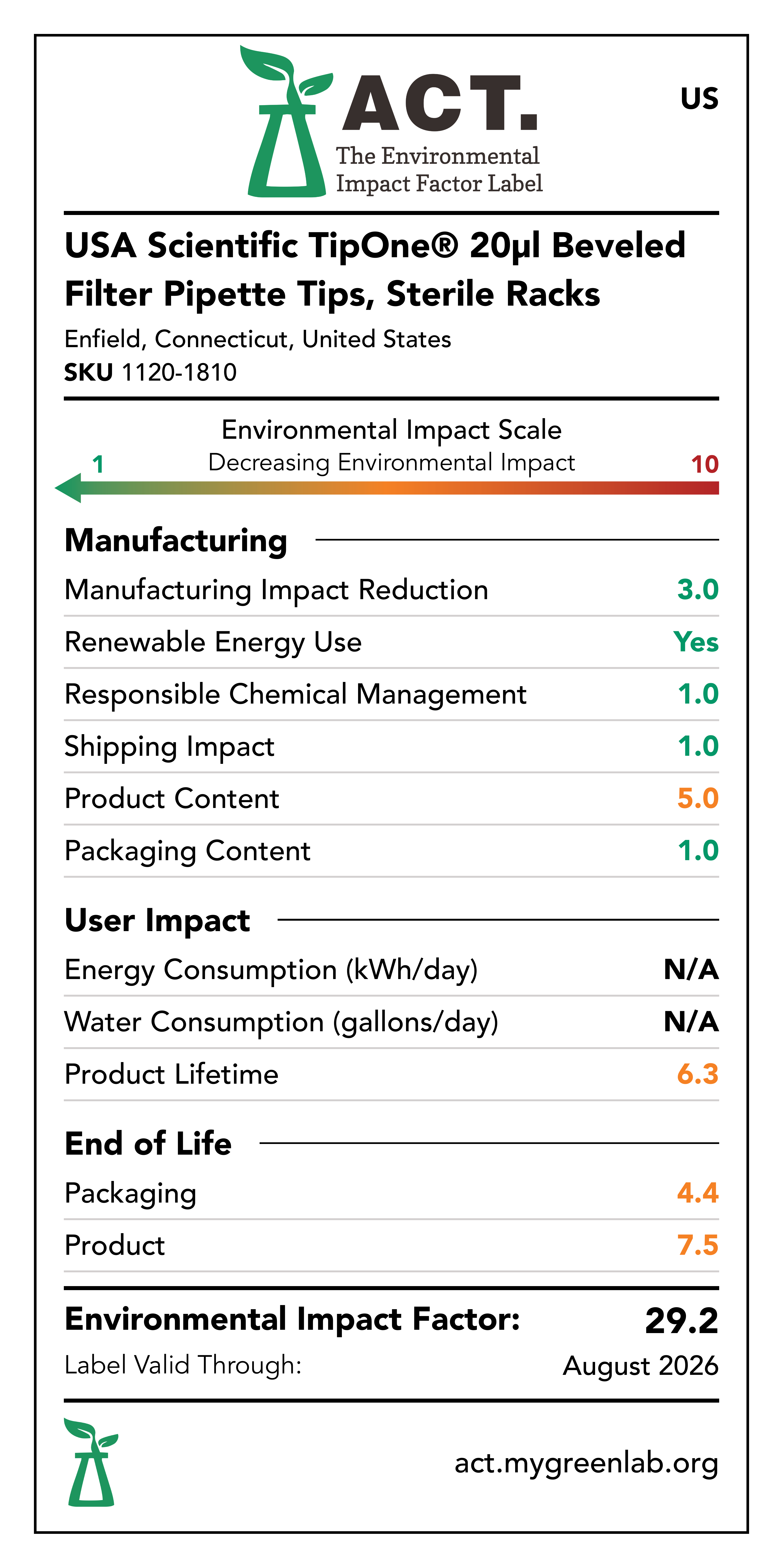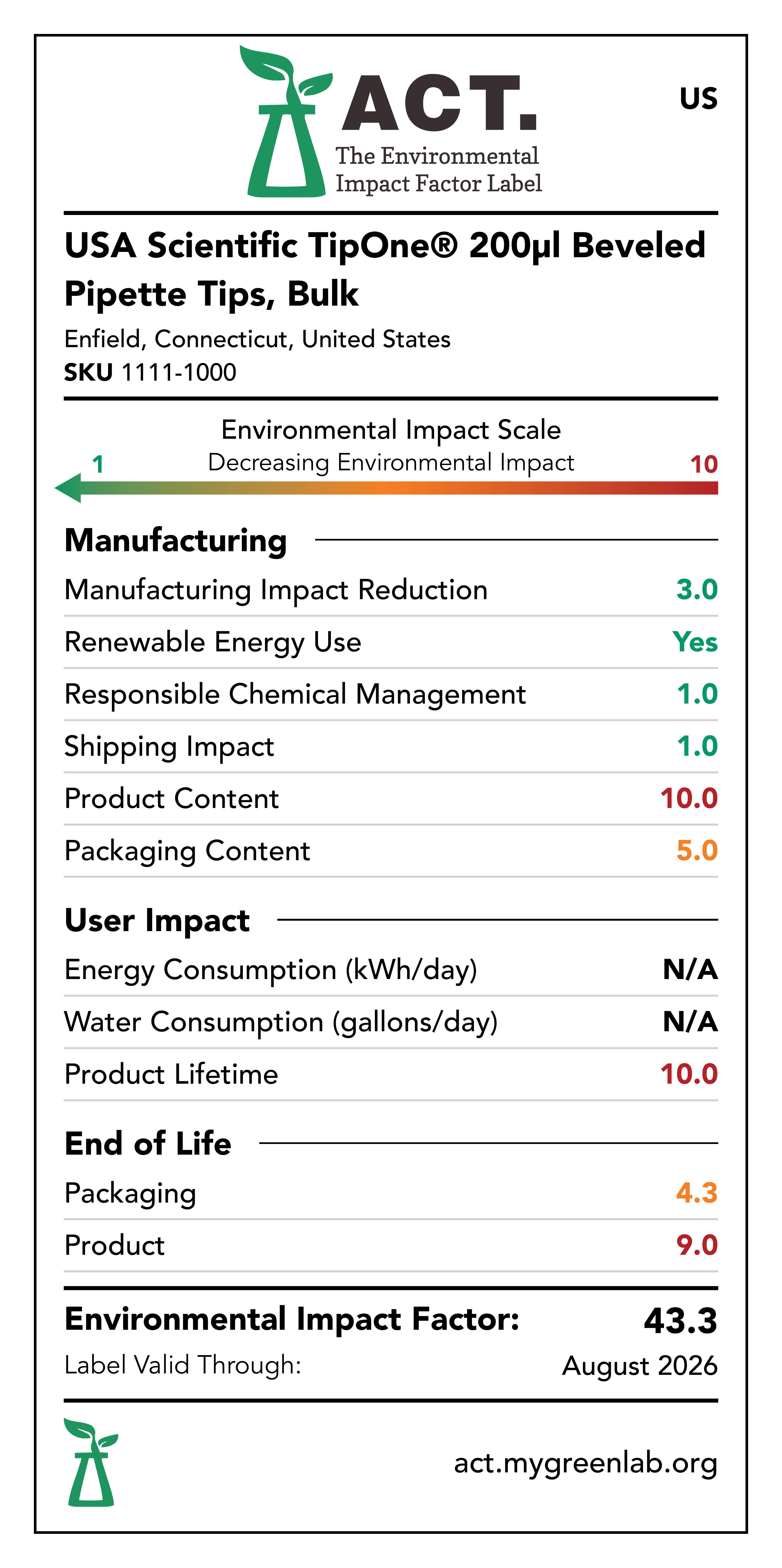 Our commitment to sustainability has been a core value at USA Scientific for decades. We take all facets of improving global health seriously. From our 100% wind-powered TipOne® production facility in Connecticut to our dedication to reducing paper usage, USA Scientific is taking multiple steps to improve our world. We have taken the next step in our sustainability journey by collaborating with My Green Lab, a non-profit organization that is dedicated to improving the sustainability of scientific research. The ACT Environmental Impact Factor Label does just that. Focusing on Accountability, Consistency, and Transparency (ACT), the labels show manufacturing, energy and water use, packaging, and end-of-life impact factors so researchers can make informed decisions about the products they use and their impact on the environment.