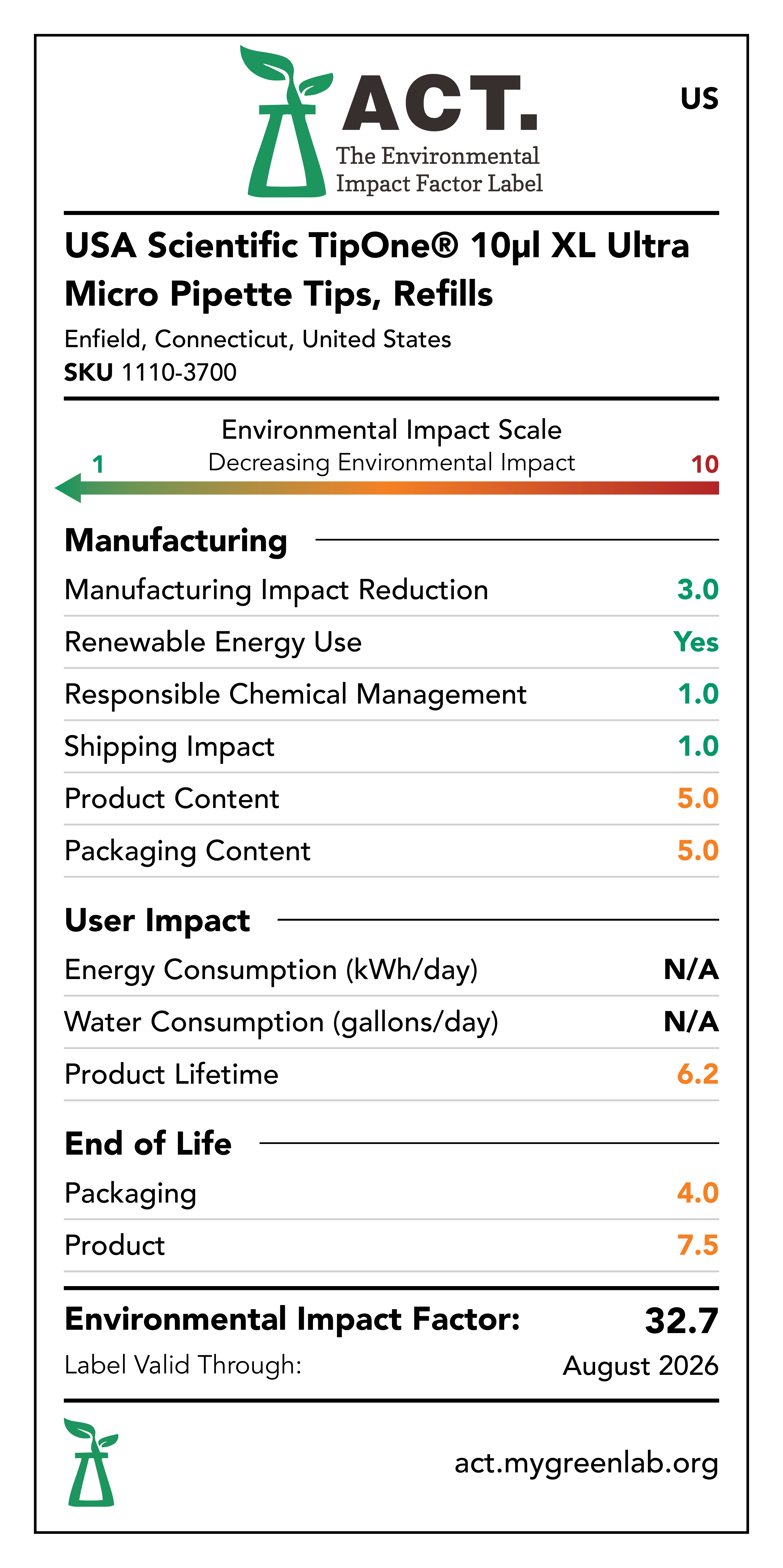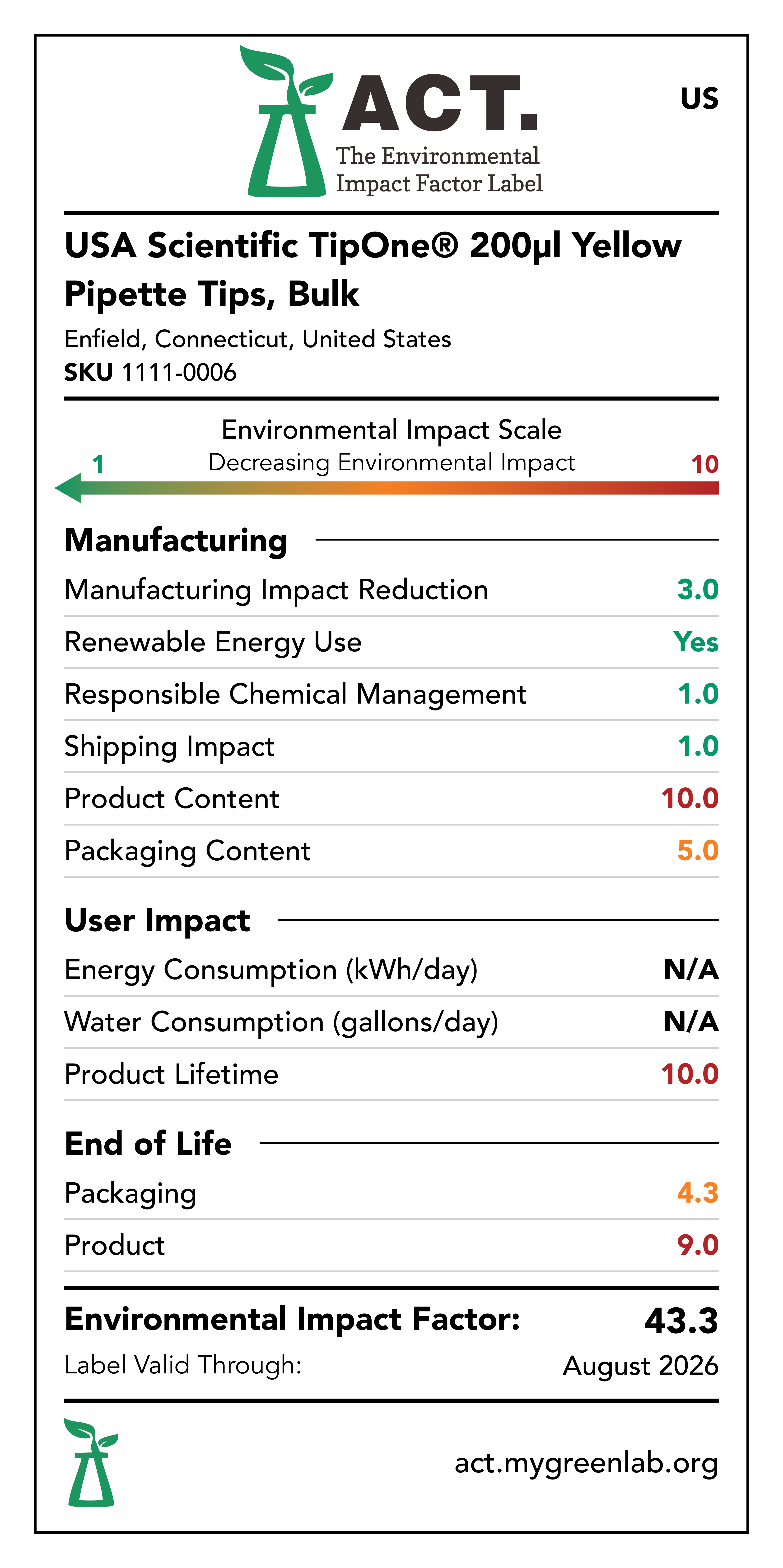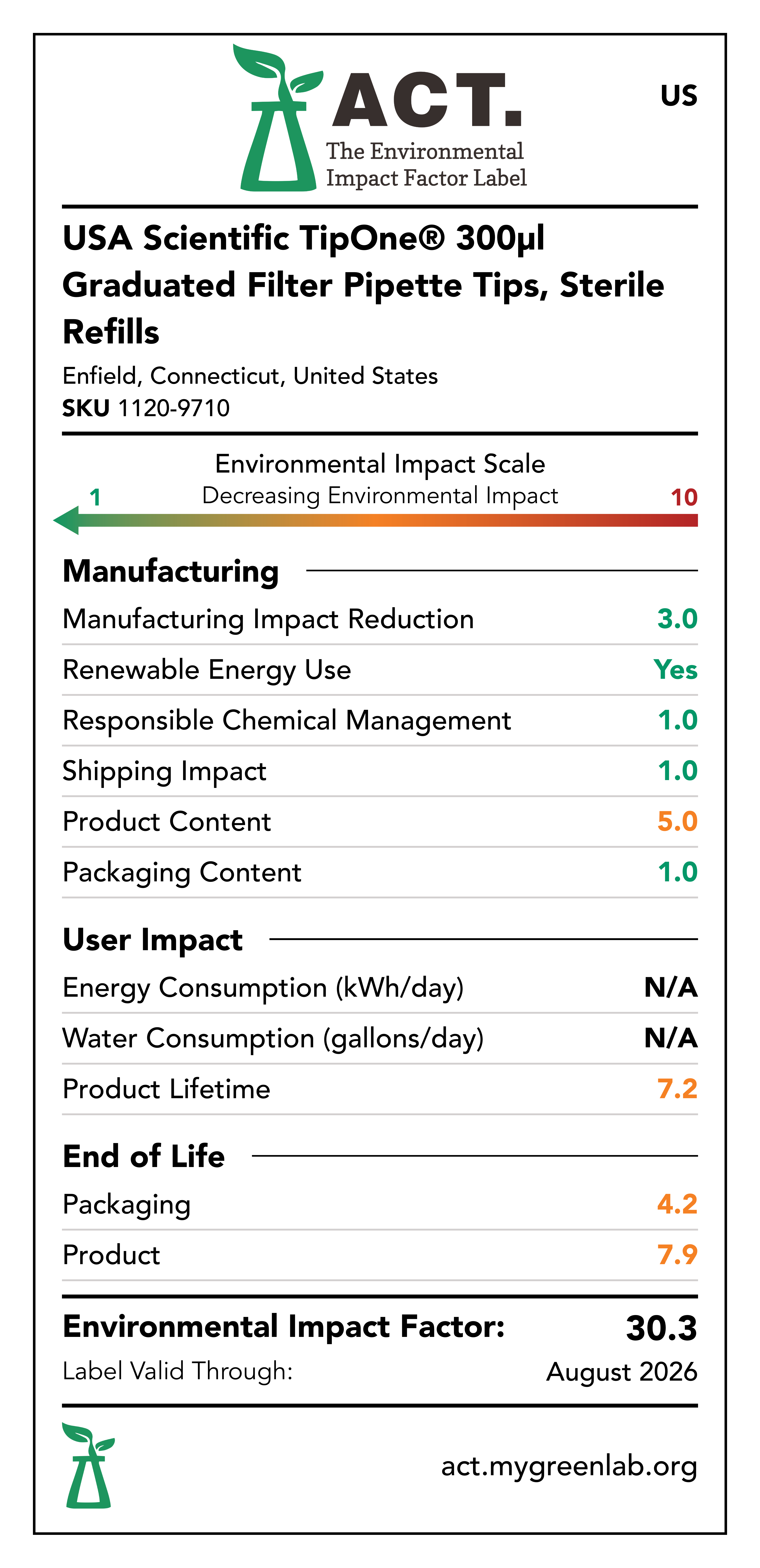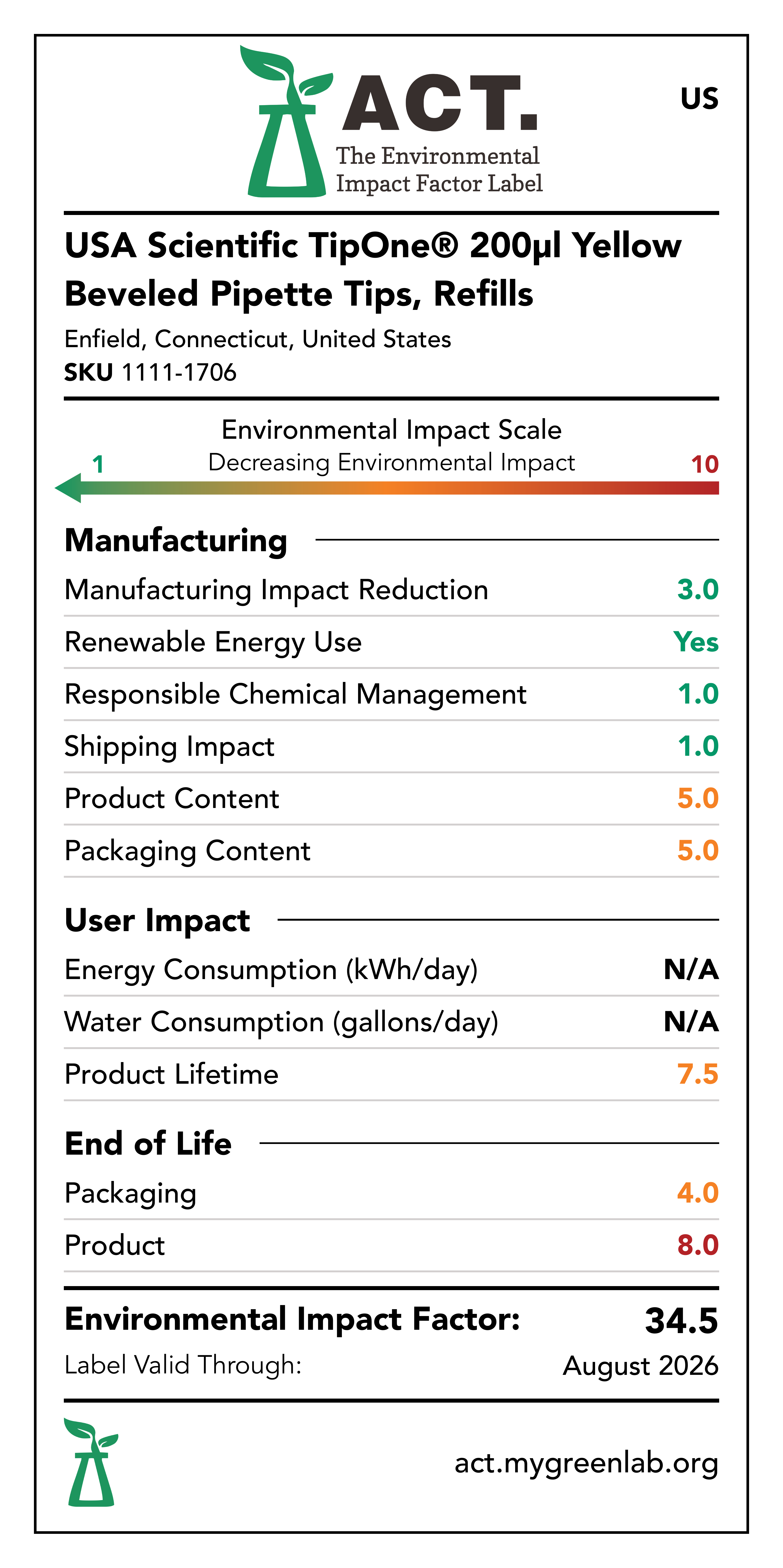 Our commitment to sustainability has been a core value at USA Scientific for decades. We take all facets of improving global health seriously. From our 100% wind-powered TipOne® production facility in Connecticut to our dedication to reducing paper usage, USA Scientific is taking multiple steps to improve our world. We have taken the next step in our sustainability journey by collaborating with My Green Lab, a non-profit organization that is dedicated to improving the sustainability of scientific research. The ACT Environmental Impact Factor Label does just that. Focusing on Accountability, Consistency, and Transparency (ACT), the labels show manufacturing, energy and water use, packaging, and end-of-life impact factors so researchers can make informed decisions about the products they use and their impact on the environment.