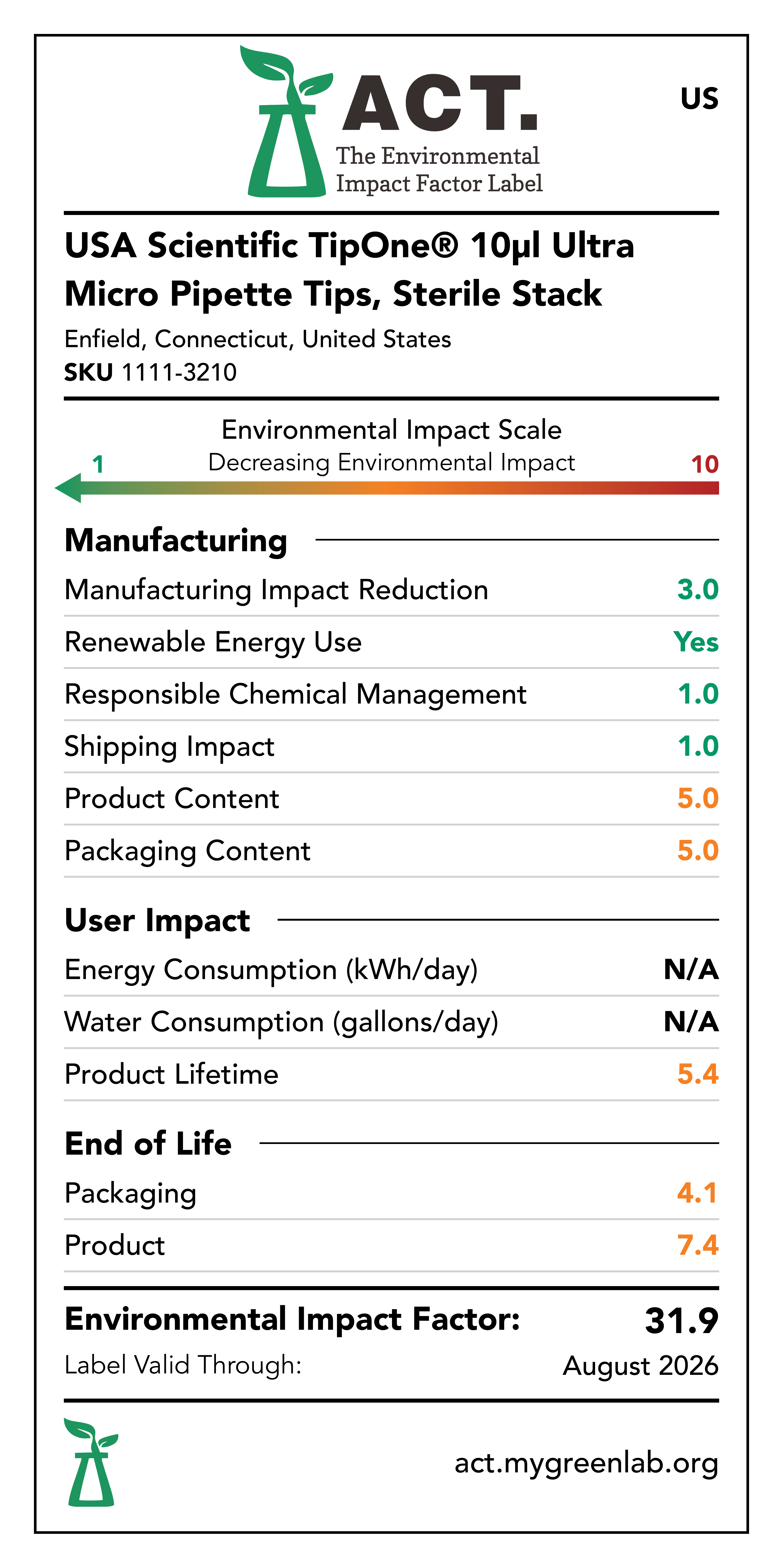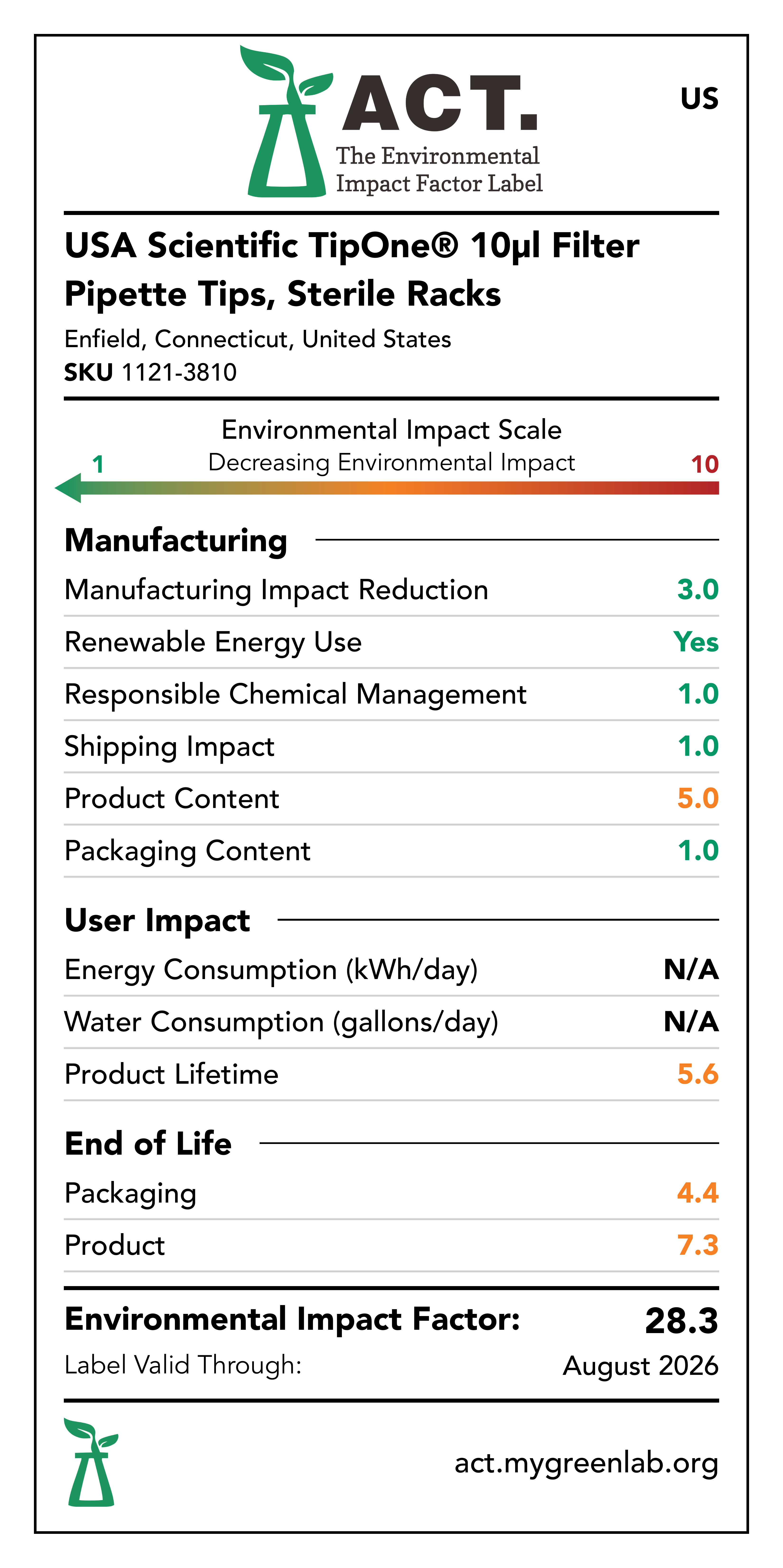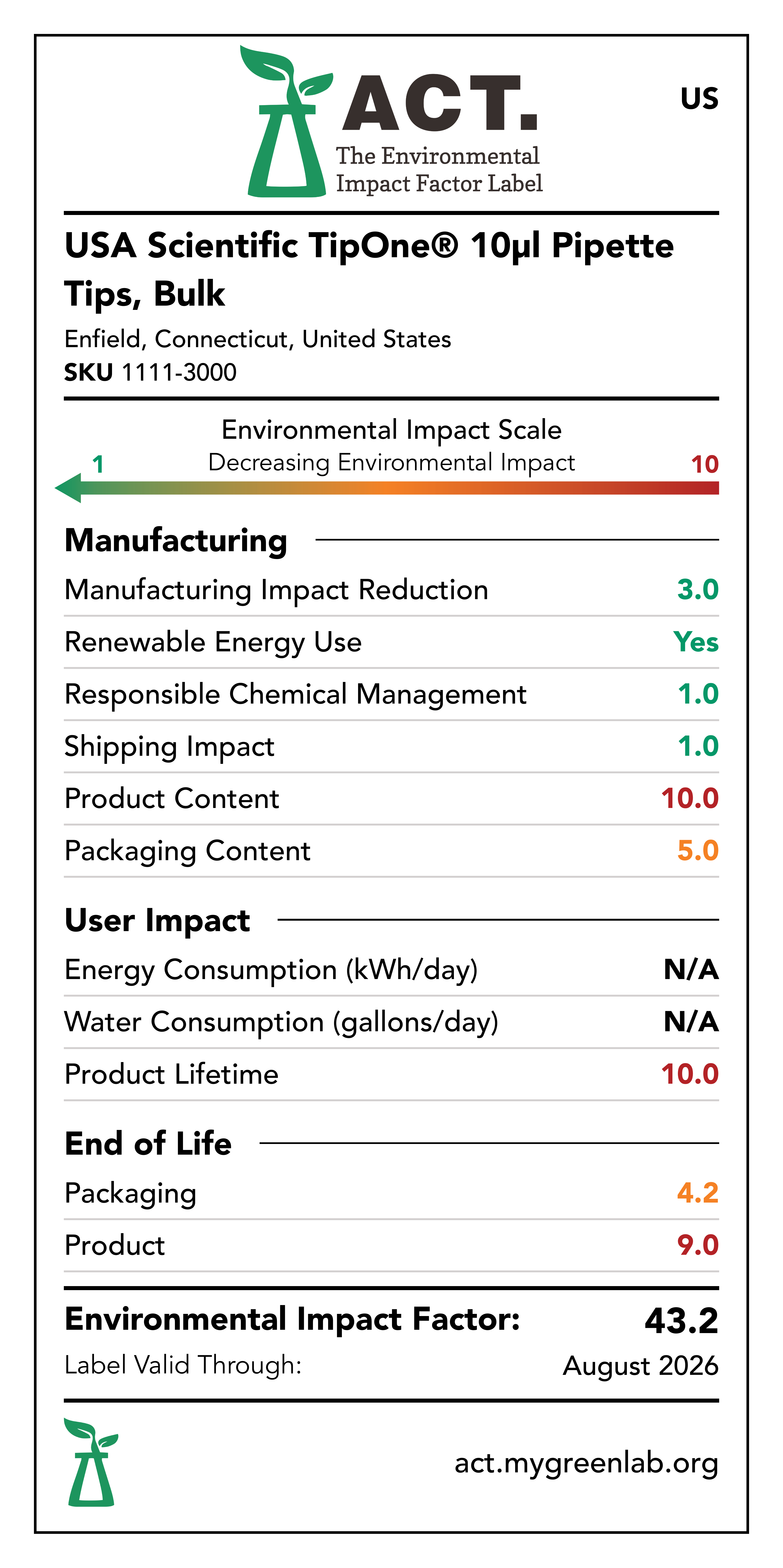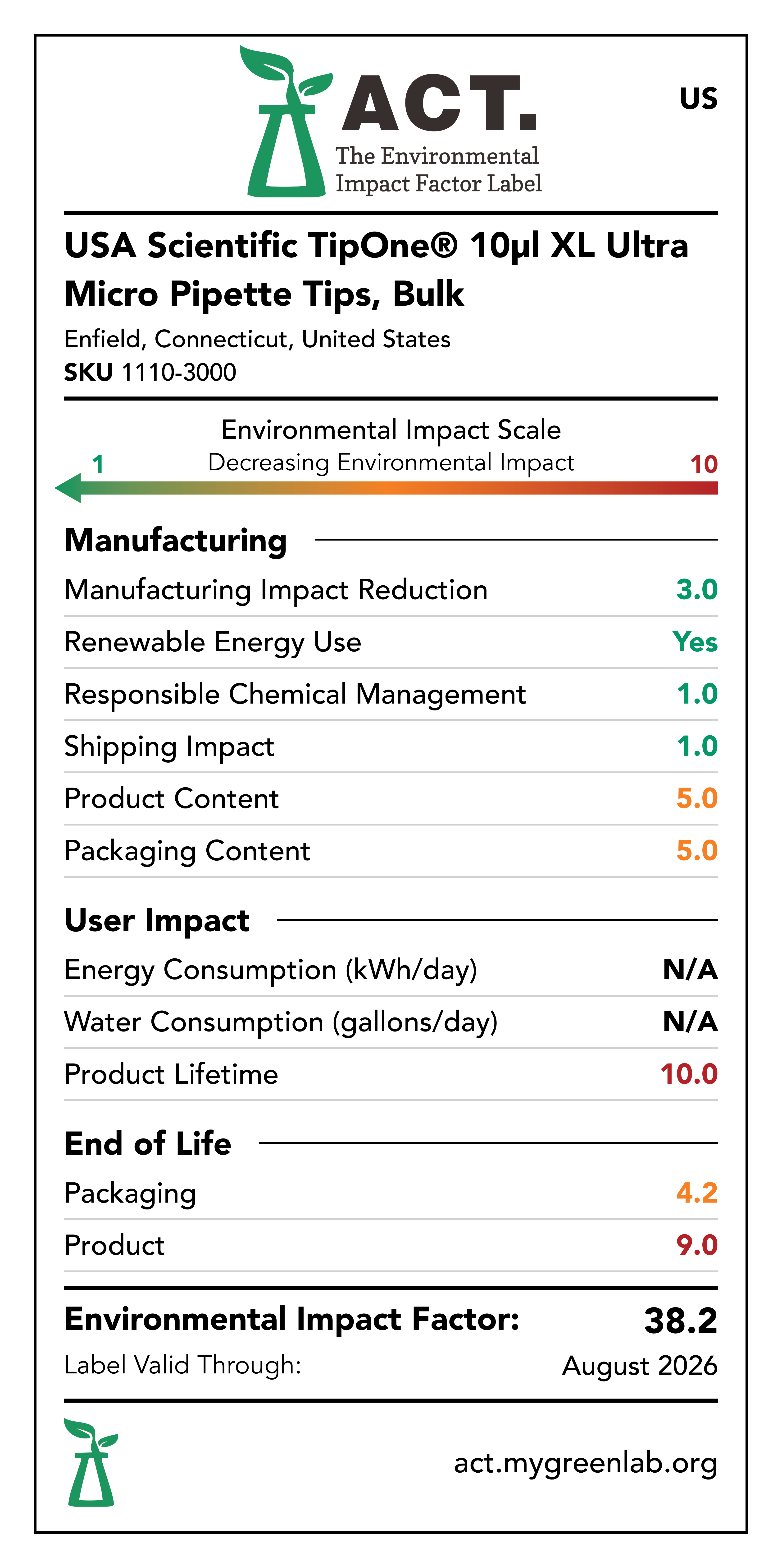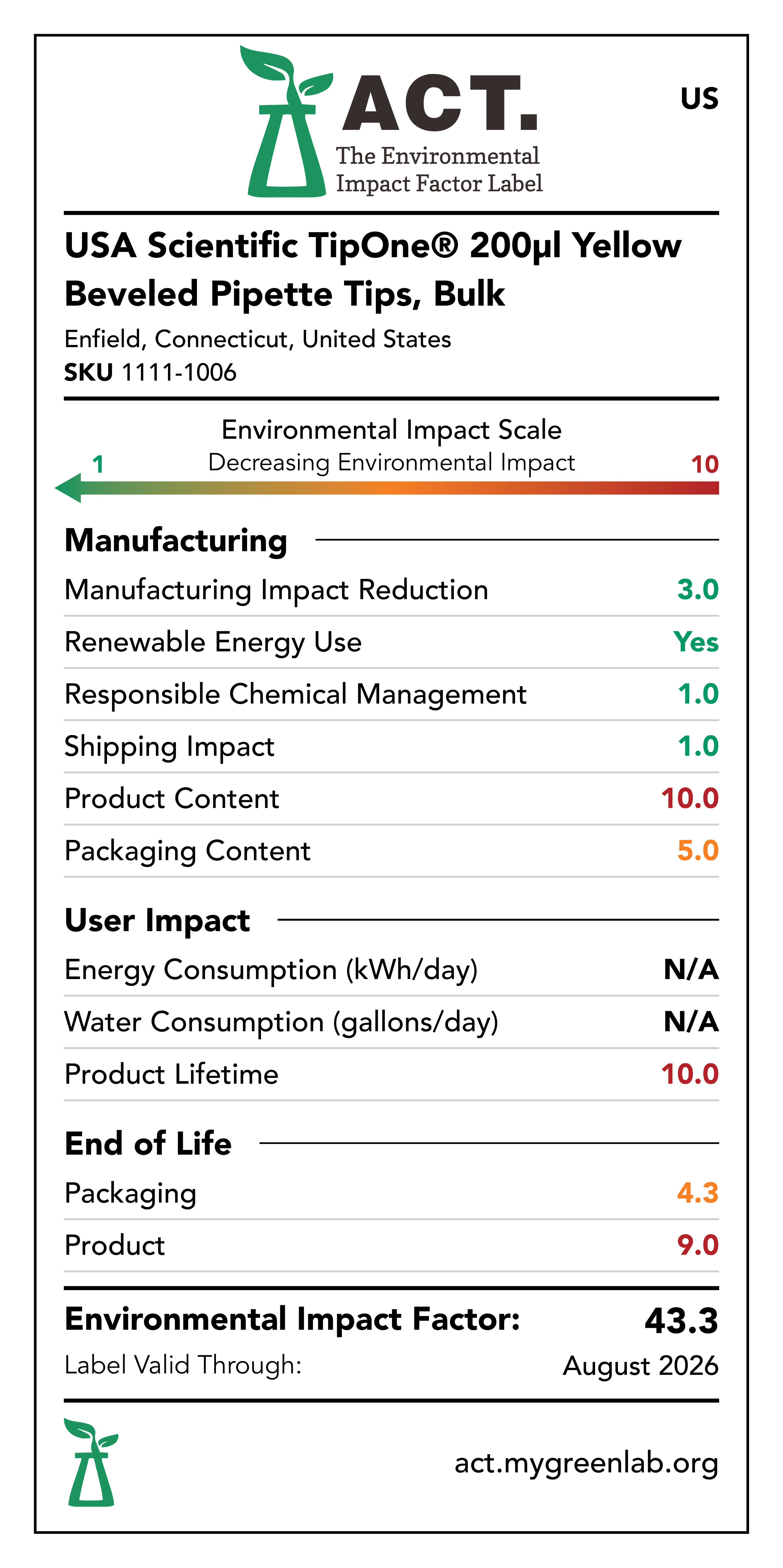 Our commitment to sustainability has been a core value at USA Scientific for decades. We take all facets of improving global health seriously. From our 100% wind-powered TipOne® production facility in Connecticut to our dedication to reducing paper usage, USA Scientific is taking multiple steps to improve our world. We have taken the next step in our sustainability journey by collaborating with My Green Lab, a non-profit organization that is dedicated to improving the sustainability of scientific research. The ACT Environmental Impact Factor Label does just that. Focusing on Accountability, Consistency, and Transparency (ACT), the labels show manufacturing, energy and water use, packaging, and end-of-life impact factors so researchers can make informed decisions about the products they use and their impact on the environment.